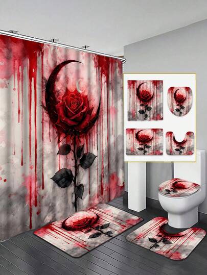 哥特玫瑰浴帘套装 - 红玫瑰与月亮图案,搭配深色调和神秘感,包含浴帘、浴垫、马桶盖套和防滑浴室垫,为浴室增添独特风格。