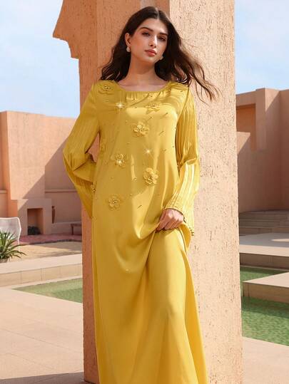 Graceveil 女士串珠圆领褶裥长袖喇叭缎面阿拉伯风格连衣裙 - 黃色 - 查看 1