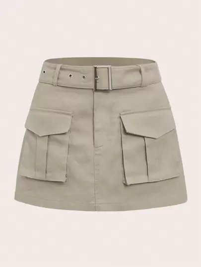 SHEIN ICON 翻蓋口袋腰帶工裝裙 - 卡其色 - 查看 1
