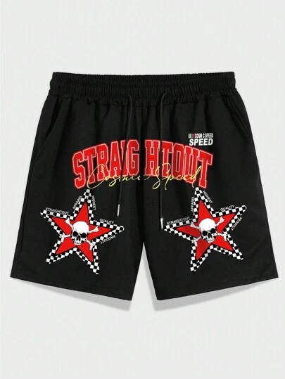 ROMWE MEN Street Life 男士骷髏星星和字母圖案腰部抽繩短褲 - 黑色 - 查看 1