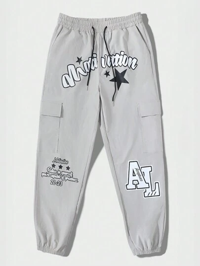 ROMWE MEN Street Life 男士星形和標語圖案側翻蓋口袋腰部抽繩工裝褲 - 灰色 - 查看 1