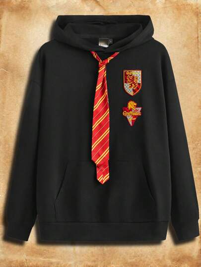 HARRY POTTER X SHEIN 中性學院風條紋領帶徽章拼接時尚連帽衛衣 - 黑色 - 查看 1