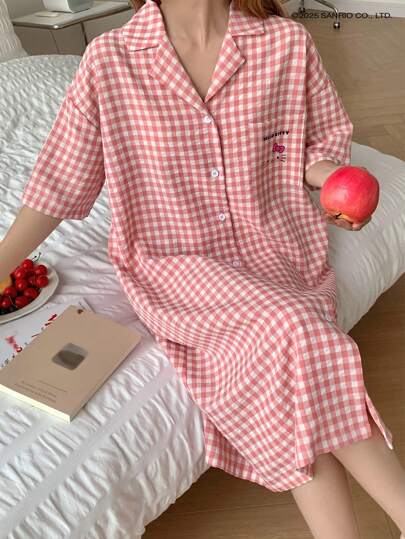 HELLO KITTY | DAZY 可爱图案徽标和字母印花格子宽松女士睡衣 - 粉色 - 查看 1
