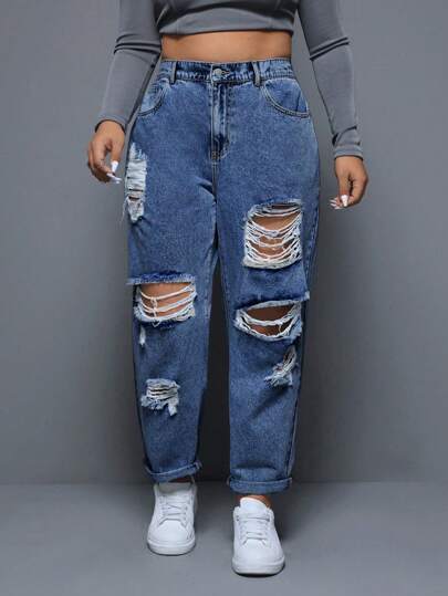 SHEIN CURVE+ 大码女式时尚破洞锥形牛仔裤 - 深色水洗藍 - 查看 1