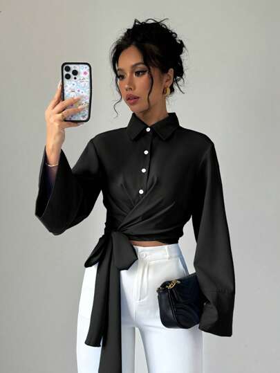 Selianne 女士休闲纯色侧系带喇叭袖衬衫,秋季女士衬衫 - 黑色 - 查看 1