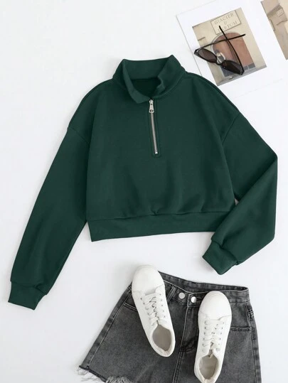 SHEIN EZwear 半拉鏈落肩袖運動衫 - 綠色 - 查看 1