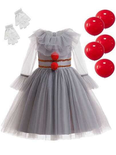 万圣节狂欢节女孩小丑服装,包括裙子和手套 - 灰色 - 查看 1