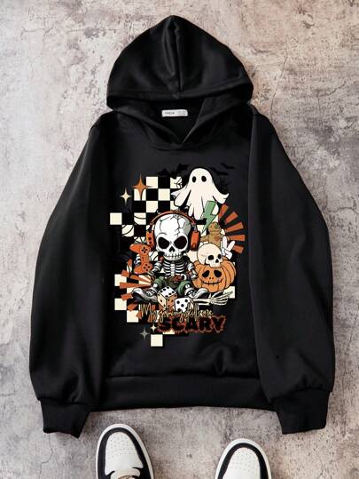 万圣节可爱幽灵、骷髅、蝙蝠和蜘蛛网南瓜图案印花连帽衫,适合青少年男孩 - 黑色 - 查看 1