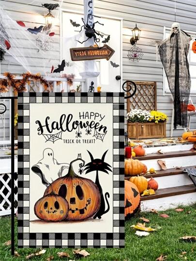 萬聖節南瓜,鬼&黑色貓花園旗幟,1入組 - 彩色 - 查看 1