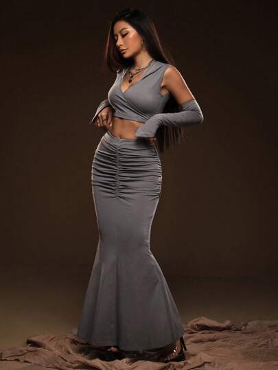 SHEIN ICON 素色鏤空短款連帽上衣&褶邊魚尾短裙 - 深灰色 - 查看 1
