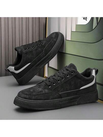 (建议选大一码)男士纯灰色系带滑板鞋,简约圆头厚底高帮运动鞋 - 黑色 - 查看 1
