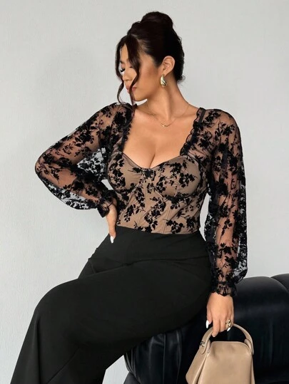 Firerie 加大码舒适休闲优雅度假百搭灯笼抽绳长袖连体裤,网眼,植绒拼接,带骨胸罩杯,紧身弹力,适合女式,春夏季 - 黑色 - 查看 1