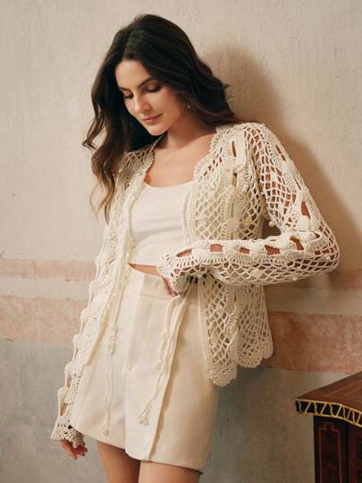 Anewsta 手工钩编 3D 锁链花卉蕾丝仿珍珠镂空百搭开衫 - 白色 - 查看 1