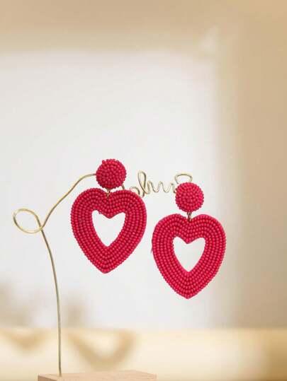 手工製作深洛莓籽珠心形中空設計伴娘耳環,情人節禮物,假日派對,母親節禮物 - 暗玫紅鏤空心 - 查看 1