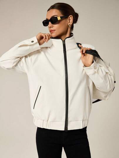 Hanevo 女士优雅皮革拼布双拉链长袖夹克 - 黑與白 - 查看 7