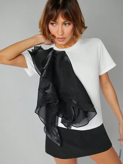 Hauture 對比層次荷葉邊修身T恤 - 黑與白 - 查看 1