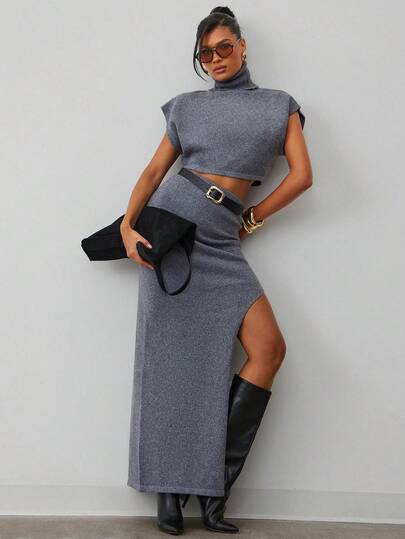Hauture 低调端庄性感休闲混色双色针织高腰高开衩毛衣长裙 - 深灰色 - 查看 2