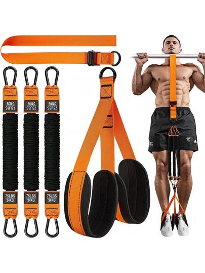 重型阻力带,最大阻力可达 75 磅,可调节,带织物脚跟和膝盖支撑,适合所有用户,尼龙材料,包括舒适的护膝和脚垫 - 橘色 - 查看 1