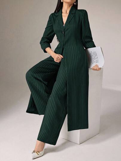 Heiryn 2 件套女士休闲条纹长外套和裤子套装,适合秋季 2 件套 - 墨綠色 - 查看 1