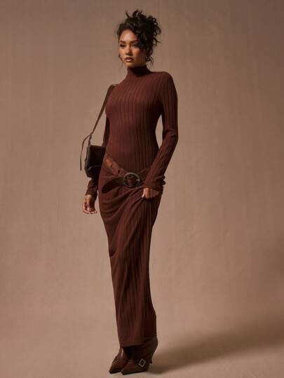 MUSERA 高领长袖罗纹长款连衣裙,优雅春夏度假外出装 - 巧克力棕 - 查看 1