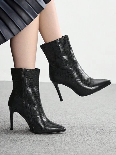 CUCCOO BIZCHIC 高品质黑色蛇皮图案中筒靴,尖头细跟优雅女靴,时尚百搭新款长靴,展现女性魅力与优雅 - 黑色 - 查看 1