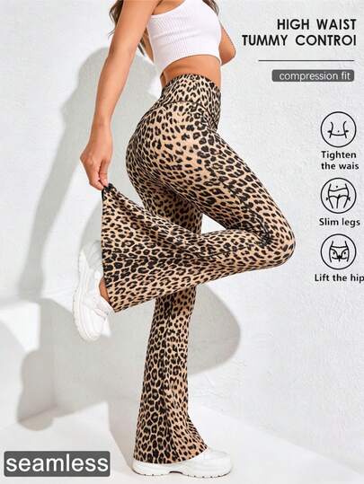 高腰豹纹喇叭瑜伽裤,收腹提臀修身打底裤,野生动物图案喇叭裤 - 彩色 - 查看 1