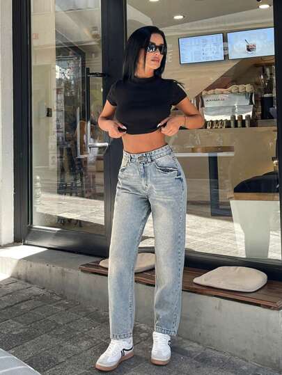 EURMUSE 高腰口袋细节优雅妈妈款牛仔裤,男友款牛仔裤 - 中等水洗藍 - 查看 1