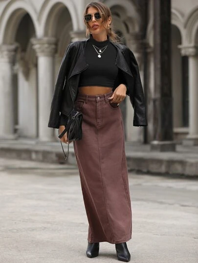 高腰後背開叉牛仔半身裙 - 鏽棕色 - 查看 1