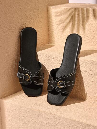 HighSole 女士休闲搭扣设计平底拖鞋,适合日常穿着 - 黑色 - 查看 1