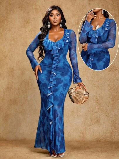Brilight 女式优雅性感印花网眼长袖 V 领荷叶边下摆长裙 - 藍色 - 查看 1