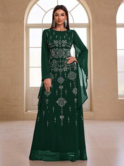 YISIKADO 水钻雪纺女士优雅连衣裙圆领印花不对称长袖舞会派对女士礼服正式和晚礼服 - 墨綠色 - 查看 1
