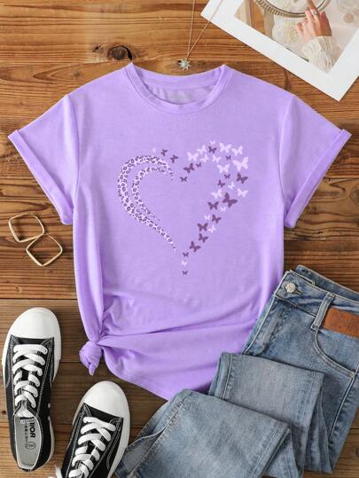 INAWLY 蝴蝶和心形印花 T 恤 图案 T 恤 女式上衣 - 淡紫色 - 查看 1