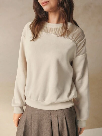 INAWLY 法式网眼拼布圆领长袖运动衫 - 米色 - 查看 6