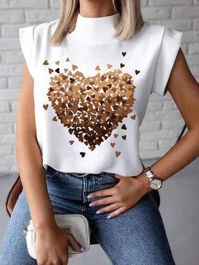 INAWLY 心形印花小立领休闲 T 恤图案 T 恤女式上衣 - 白色 - 查看 1
