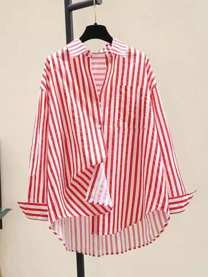 INAWLY LUNE 女士休闲条纹印花长袖胸袋衬衫,秋冬款 - 紅色 - 查看 1