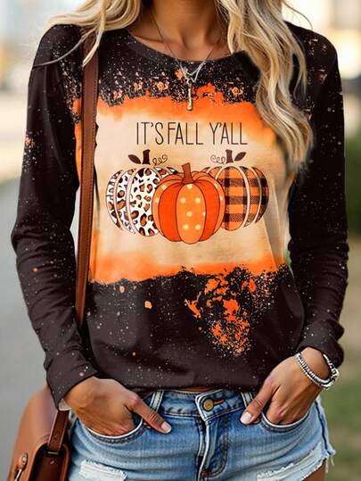INAWLY 大码万圣节南瓜数码印花长袖T恤,秋季上衣