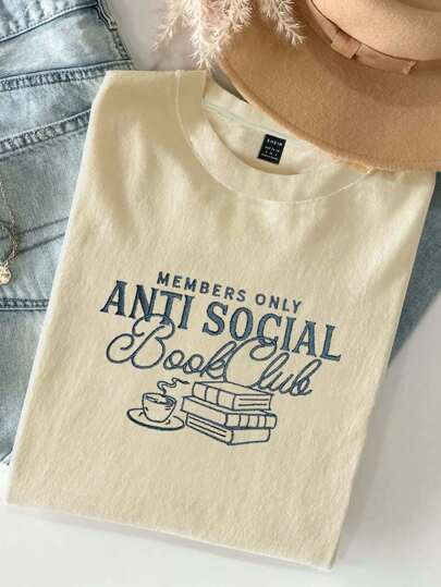 INAWLY 女式 T 恤 反社会读书俱乐部刺绣圆领衫、读书俱乐部 T 恤、爱书人圆领衫、书卷气圆领 T 恤、节日 T 恤、时尚潮流、时尚 T 恤衫、读书人礼物 - 杏色 - 查看 4