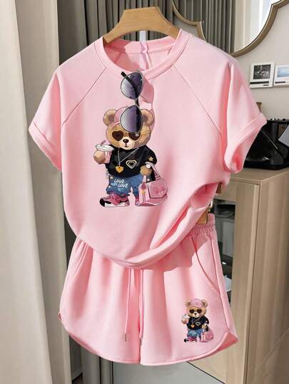 INAWLY 女式夏季插肩卡通熊印花T恤和短裤套装 - 粉色 - 查看 1