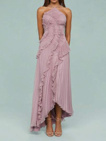 Y2k Ruffle Long Dress For Women Halter Backless Irregular Hem Ruched Boho Maxi Dress - Blush Crush - 查看 1