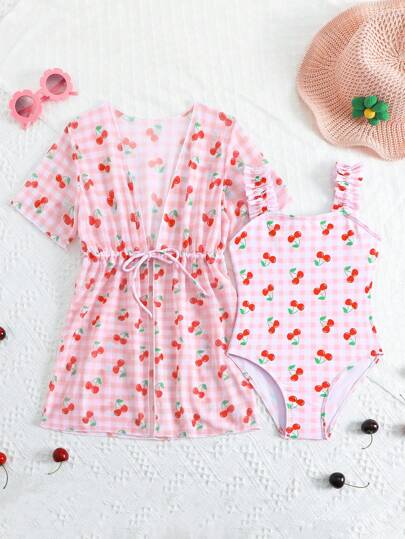 1 套少女热带椰子树印花连体泳衣 + 罩衫 - 彩色 - 查看 1