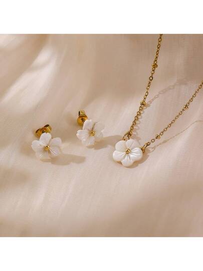 1 件 18K 金真空镀不锈钢贝壳花耳钉和开口戒指首饰套装,精致百搭的欧洲风格 - 花朵 - 查看 1
