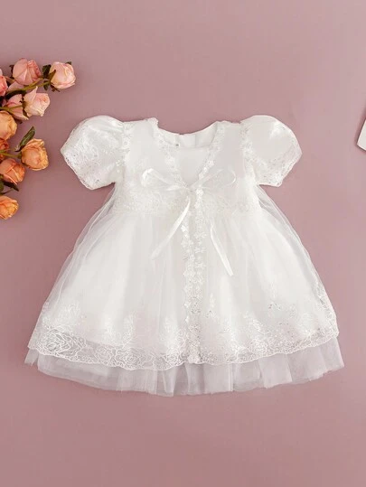 婴儿女孩白色洗礼礼服,刺绣洗礼袍,0-2 岁 - 白色 - 查看 1
