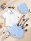 男婴两件套服装:蓝白条纹短袖翻领衬衫,配棕色纽扣和皮革贴片,搭配白色短裤,适合用餐、派对、生日等秋冬季场合。