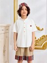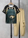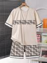 SHEIN 2 件套青少年男孩休闲牛仔拼布针织 T 恤和短裤,时尚街头风格牛仔拼接装
