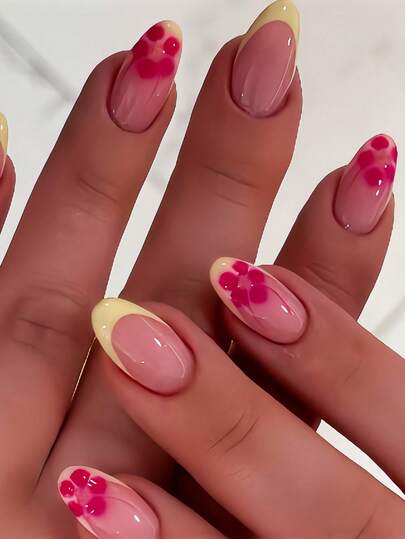 使用 24 片中等杏仁形按压式假凝胶指甲立即提升您的外观,优雅清新奶油黄色细边法式时尚春夏玫瑰粉色光环夏威夷花朵全覆盖假指甲,适合女性和女孩,包括 1 片粘合标签和 1 片迷你条状果冻凝胶,随机发货美甲用品指甲 - 彩色 - 查看 1
