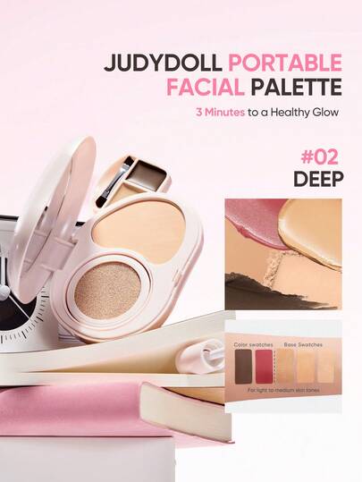 JUDYDOLL 便携式面部彩妆盘 - 多功能粉盒,包含气垫粉底、遮瑕膏、腮红、唇膏和眉笔,方便初学者和外出化妆 - #02 Deep - 查看 1