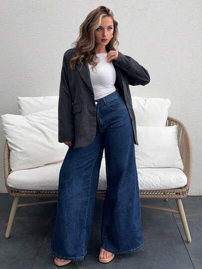 Jeta Ari 女士条纹印花休闲长袖西装外套复古风格商务休闲女装秋装 - 灰色 - 查看 1