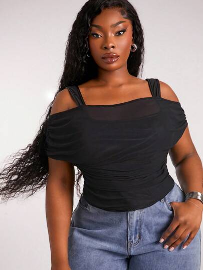 SHEIN SXY 大码女式时尚街头时尚修身弹力涂层皮革和网眼分层褶皱短 T 恤,适合日常穿着、西部装、邮轮装、音乐节、音乐会、狂欢派对、海滩度假、约会之夜、生日、单身派对、俱乐部、可爱、休闲、购物、街头服饰、外出,易于搭配且看起来苗条,凸显身材,修饰身材 - 黑色 - 查看 1