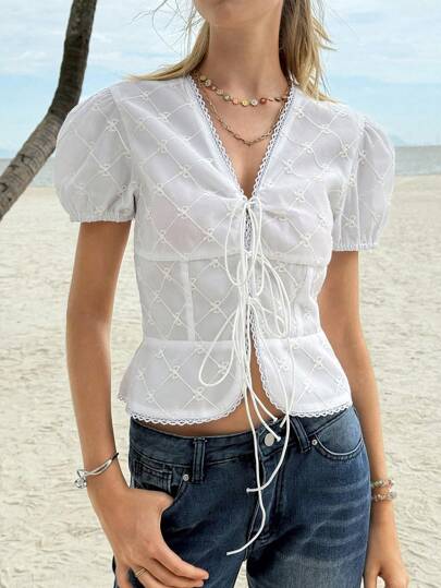 Jouncy 女士夏季休闲时尚度假蝴蝶结纹理 V 领泡泡袖前系带衬衫