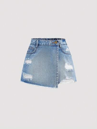 SHEIN Girlism 春夏款青少女波西米亞風撕裂高腰包襠牛仔裙短褲,兒童暑假服裝 - 中等水洗藍 - 查看 1
